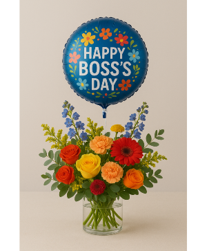 Show your appreciation in style with this vibrant Boss’s Day Celebration Bouquet! Bursting with color and personality, this cheerful arrangement features a mix of bright orange lilies, sunny yellow gerbera daisies, purple liatris, and lush greenery, all artfully designed in a clear glass vase.