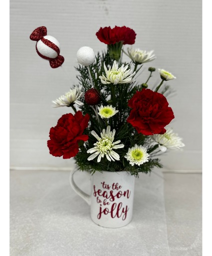 ✨ Priced exclusively for local delivery and pickup only. This arrangement is available within our local service area to ensure the freshest and highest-quality presentation. Bring festive cheer to any room with our “Tis the Season to Be Jolly” Christmas Mug Flower Arrangement. This joyful holiday display features fresh red carnations, white chrysanthemums, seasonal greenery, and sparkling holiday accents designed to capture the warmth and magic of Christmas. Arranged in a charming ceramic mug printed with a cheerful holiday message, this piece makes the perfect Christmas gift, holiday table decoration, or festive floral centerpiece. Hand-crafted with care, this arrangement adds a pop of vibrant red and crisp winter white to your home or office. Ideal for spreading holiday spirit to friends, family, coworkers, or clients.